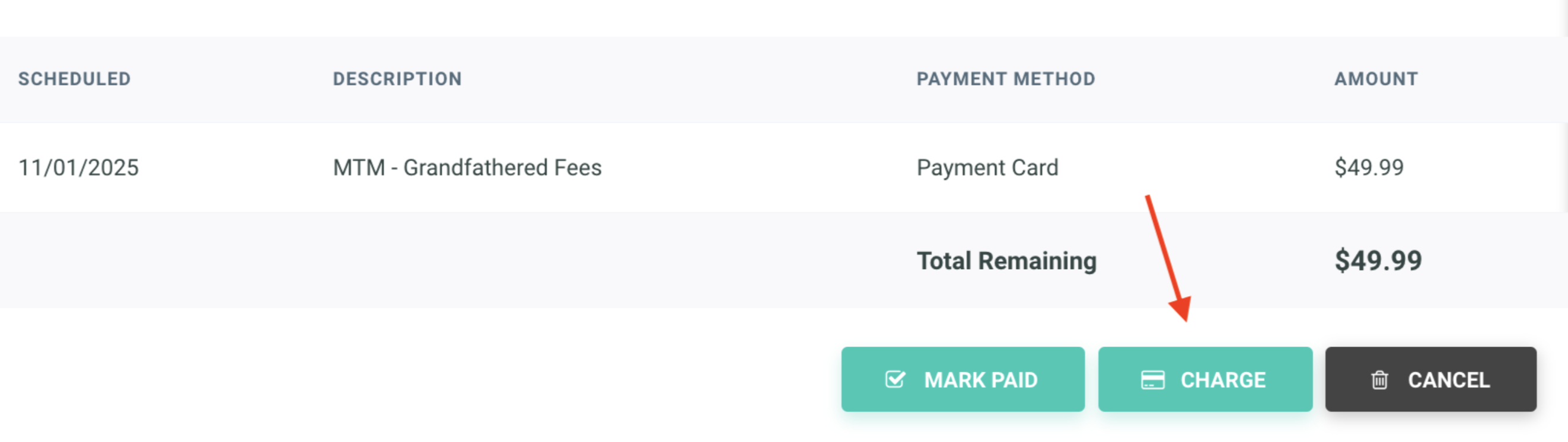 - You can then go back to the declined transaction in Gymdesk and click "Charge" to reprocess the same transaction. You do not want to create a new charge in Gymdesk. See screenshot below.